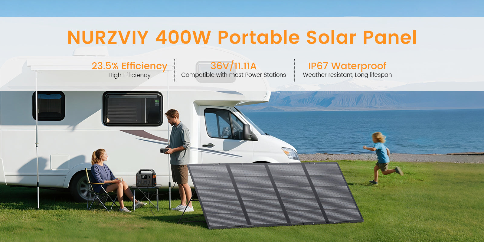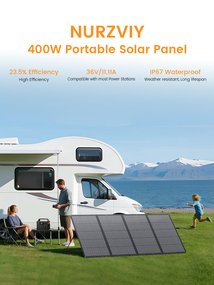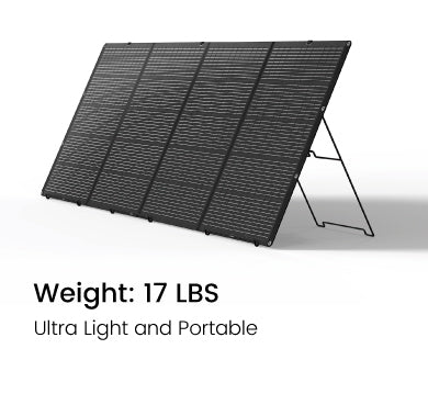 The Nurzviy SolarEpoch 400P, weighs in at just 17 lbs! With its fully adjustable and detachable stand, setting it up or packing it away is a breeze—even for one person. Whether you're on the go or powering up your adventure, the 400W portable solar panel delivers power and portability like never before!